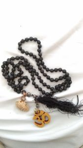 After that, it migrated to another mala – this one made of beads of black volcanic rock, perhaps very fitting given the little shell’s possibly ancient origins.